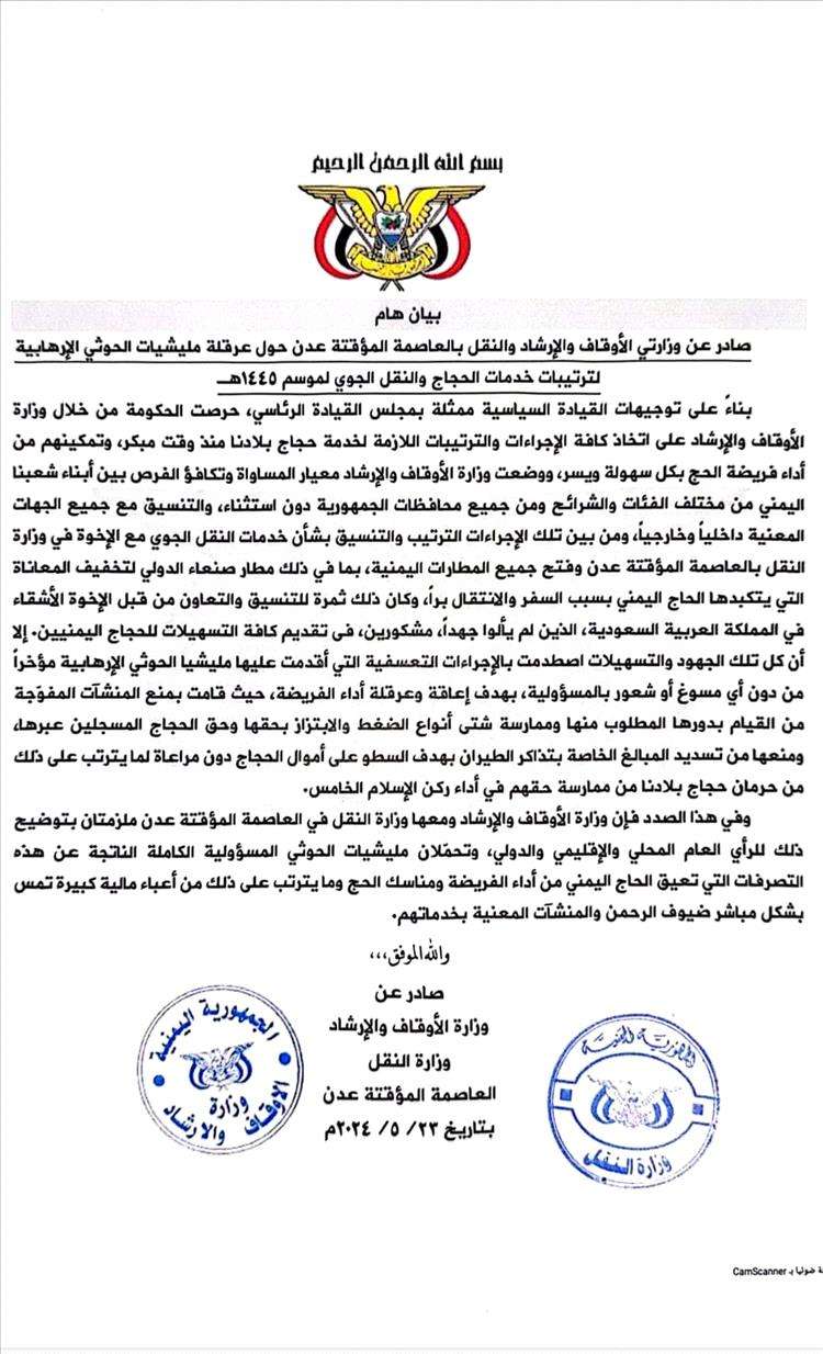 أصدرتا وزارتي الأوقاف والإرشاد و النقل بالعاصمة المؤقتة عدن بيانا هاما حول عرقلة مليشيات الحوثي الإرهابية لترتيبات خدمات الحجاج والنقل الجوى لموسم 1445هـ