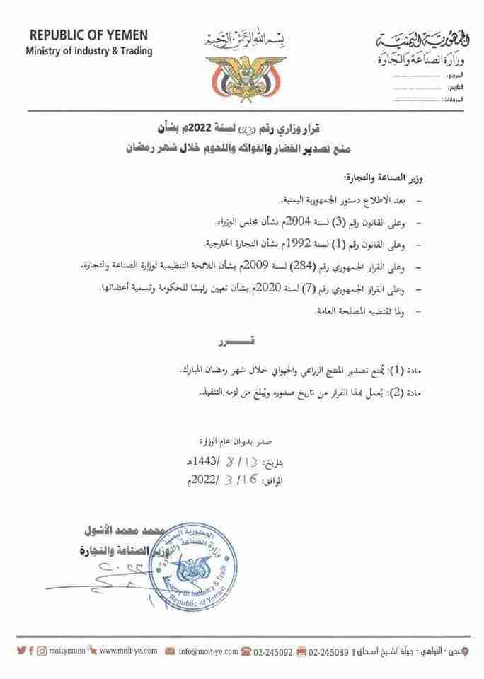 وفي مادته الأولى نص القرار على منع تصدير المنتج الزراعي والحيواني خلال شهر رمضان المبارك.