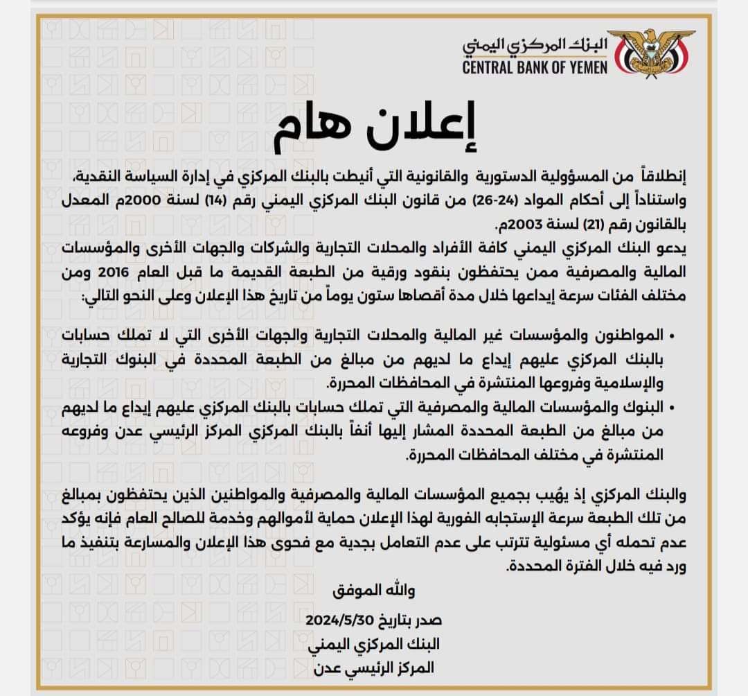 دعا البنك المركزي اليمني كافة الأفراد والمحلات التجارية والشركات والجهات الأخرى والمؤسسات المالية والمصرفية ممن يحتفظون بنقود ورقية من الطبعة القديمة ما قبل العام 2016 من مختلف الفئات سرعة إيداعها خلال مدة أقصاها ستون يوماً من تاريخ هذا الإعلان.