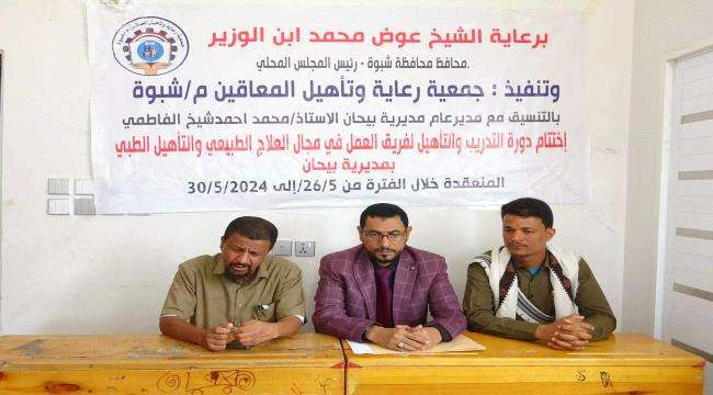اختتمت في مبنى جمعية رعاية وتأهيل المعاقين بمحافظة شبوة فعاليات الدورة التدريبية الخاصة بتأهيل فريق العمل في مجال العلاج الطبيعي بمديرية بيحان والتي تظمتها وعلى مدى أسبوع الجمعية بالتنسيق مع قيادة السلطة المحلية في المديرية وتلقى خلالها المشاركون فيها المعارف النظرية والتطبيقية اللازمة فيما يتعلق بالعلاج الطبيعي للمعاقين حركيا .