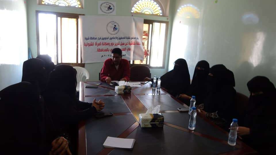 نقابة الصحفيين والاعلاميين الجنوبين بشبوة تنظم حلقة نقاشية عن سبل تعزيز دور ومكانة المرأة الشبوانية في العمل الإعلامي بالمحافظة