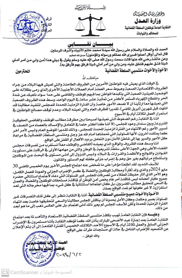 وأضاف البيان أننا وسط هذه الظروف والواقع الذي يعيشه القاضي والموظف معا نستغرب من تصرفات مجلس القضاء الأعلى وهي الجهة الأعلى سلطة تشريعية في الوطن والتي من مهامها الأولى في الرقابة على دستورية القوانين واللوائح والأنظمة والقرارات في البلاد، وليس النزول إلى أدنى مستوى في البحث عن الموظفين واستقطاع مرتباتهم بغير حق وهم في إضراب جزئي كفله لهم الدستور والقانون،كما أكد البيان بان مخرجات الاجتماع الاستثنائي لمجلس القضاء الأعلى يوم الخميس الموافق 30 مايو2024م تعد استفزازية لاغير كونها لم تمت للواقع بصلة.