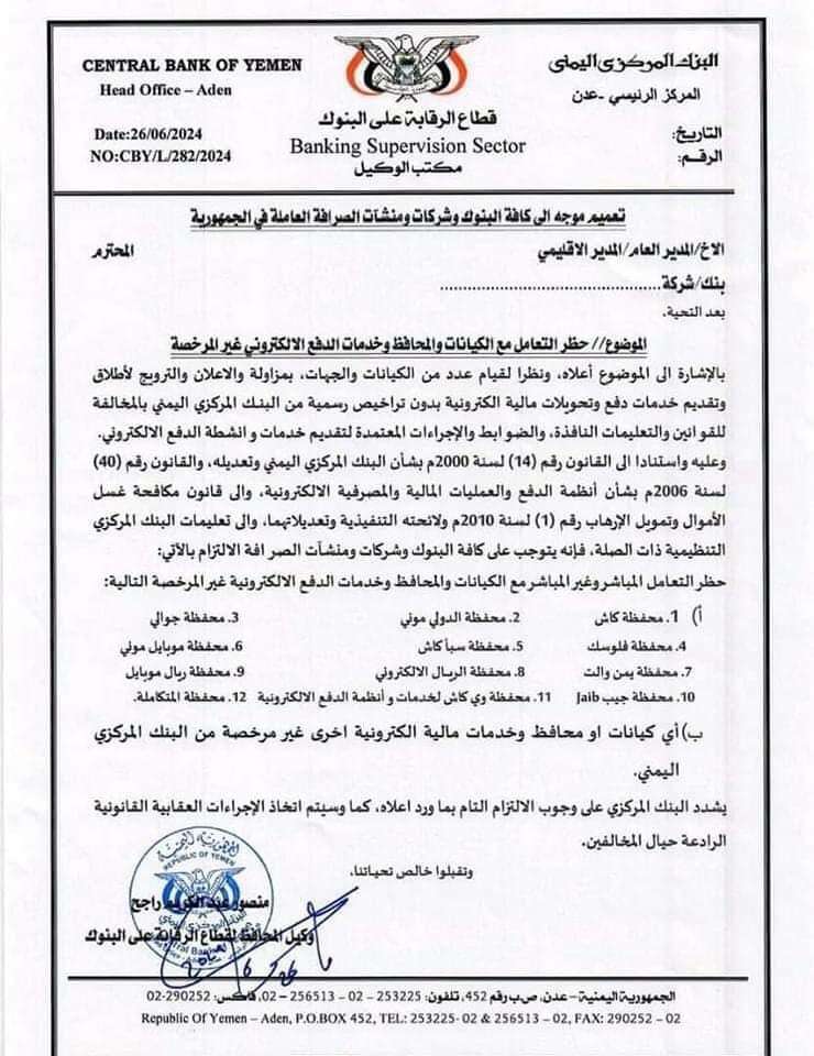 أصدر البنك المركزي اليوم تعميم الى كافة البنوك وشركات ومنشآت الصرافة العاملة في الجمهورية بحظر التعامل مع الكيانات والمحافظ وخدمات الدفع الإلكتروني التي يتم مزاولتها والترويج لإطلاق خدماتها في الدفع وتحويلات مالية إلكترونية دون تراخيص رسمية من البنك المركزي اليمني.