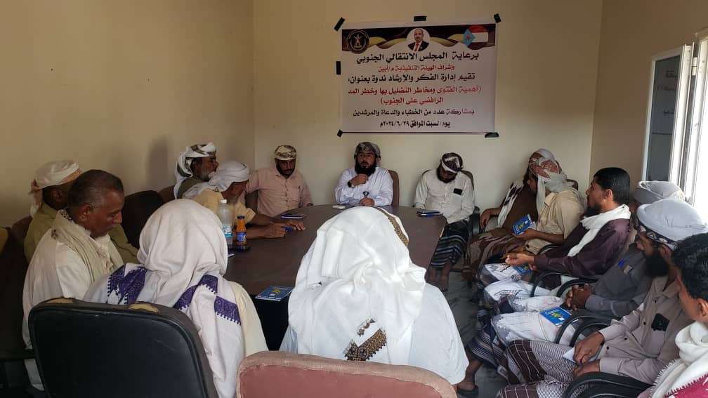 نظمت إدارة الفكر والإرشاد بالهيئة التنفيذية للقيادة المحلية للمجلس الانتقالي الجنوبي في محافظة أبين، اليوم السبت، ندوة دينية تركزت حول "أهمية الفتوى ومخاطر التضليل بها وخطر المد الرافضي على الجنوب" لتعزيز الوعي والفهم لدى الخطباء والدعاة والمرشدين في دلتا أبين بشأن دور الفتوى وتأثيراتها الإيجابية والسلبية على المجتمع.