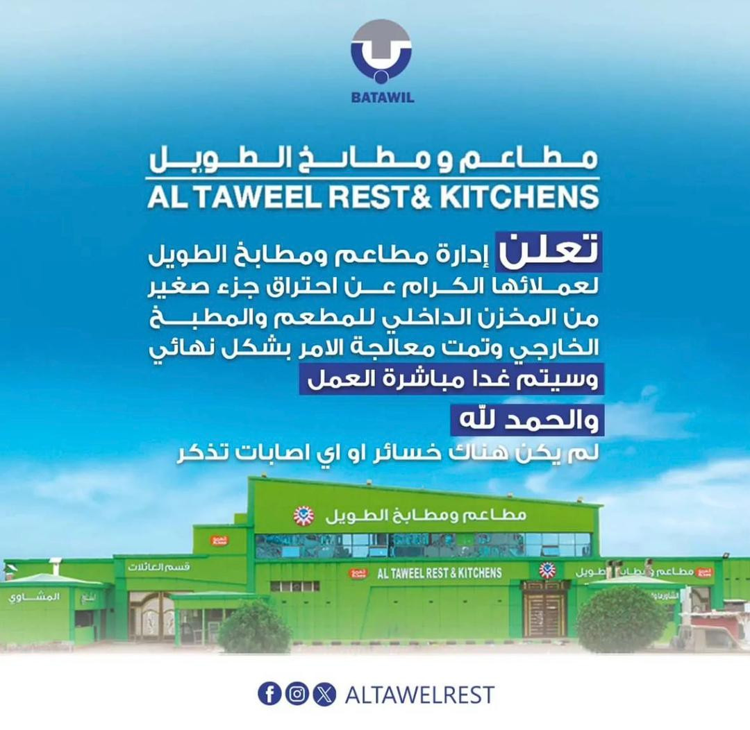 صرحت إدارة مطاعم ومطابخ الطويل أن الحريق الذي نشب عصر يوم السبت كان محدودًا حيث اقتصر على جزء صغير من المخزن الداخلي والمطبخ الخارجي للمطعم.