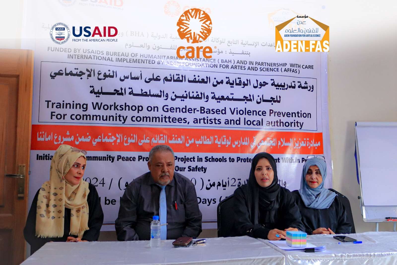 دشنت مؤسسة عدن للفنون والعلوم اليوم الأحد الورشة التدريبية الخاصة بالوقاية من العنف القائم على النوع الاجتماعي بتمويل من مكتب المساعدات الإنسانية التابع للوكالة الأمريكية (BHA) والشراكة مع منظمة كير.