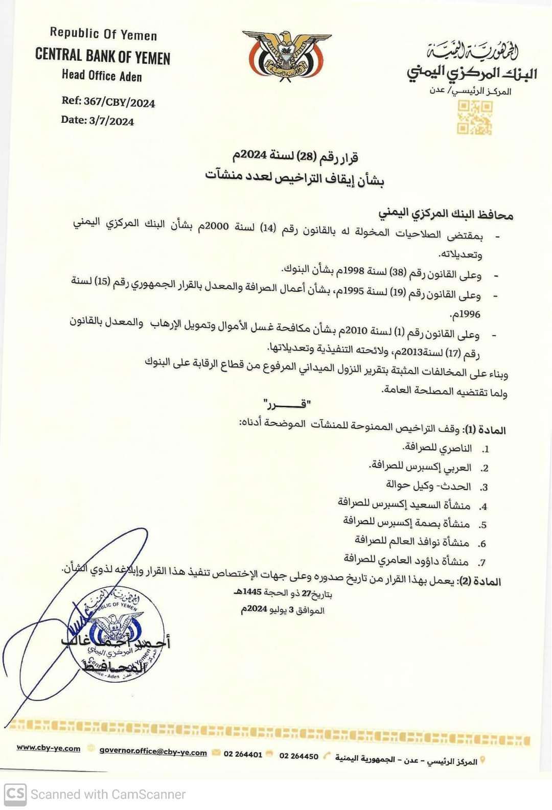 أصدر محافظ البنك المركزي اليمني أ. أحمد أحمد غالب اليوم الأربعاء الموافق 3 يوليو 2024م، قرار بإيقاف تراخيص لمنشآت الصرافة التالية: