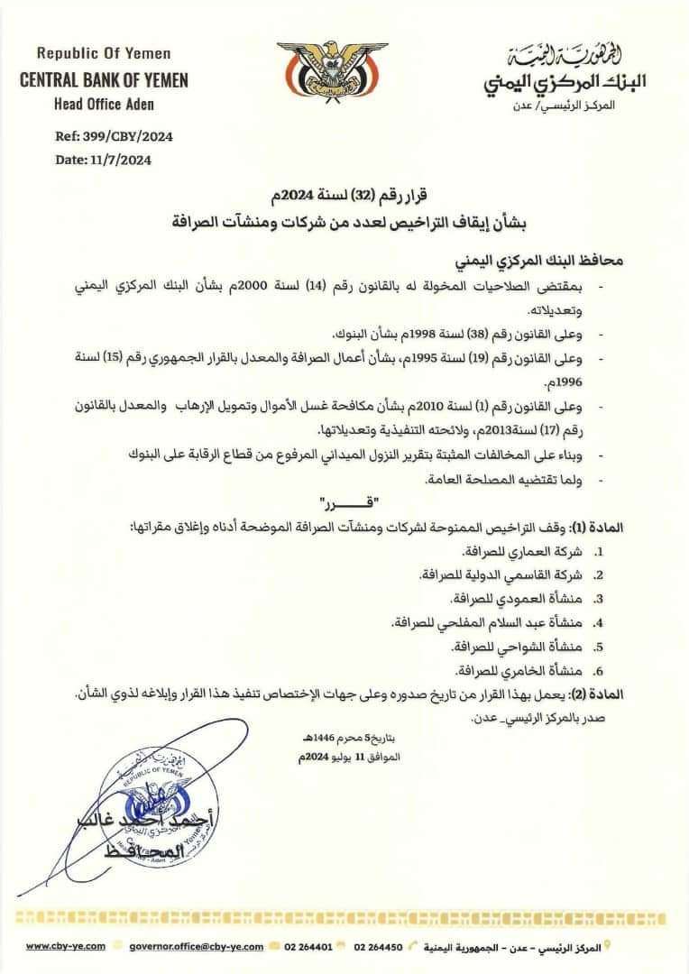 أصدر محافظ البنك المركزي اليمني أ. أحمد أحمد غالب قرار رقم (32) بشأن إيقاف تراخيص عدد من شركات ومنشآت الصرافة التالية: