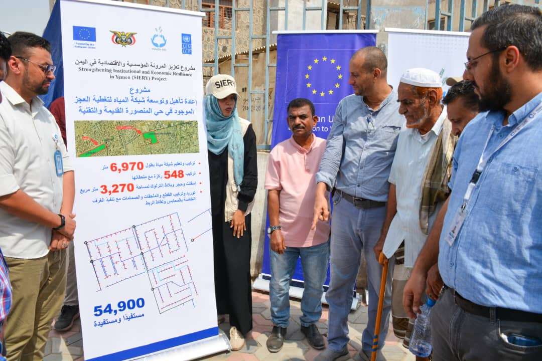 وتسلم مدير عام المؤسسة المهندس محمد باخبيرة، موقع المشروع الذي ينفذه برنامج الأمم المتحدة الإنمائي (UNDP) عبر منظمة يمن ايد بتمويل من الاتحاد الأوروبي ويتكون من تركيب وتعقيم شبكة مياه بطول 6 ألف و970 متر، وتركيب 548 ركزة مع ملحقاتها، واسفلت وحجر وانترلوك بمساحة 3 ألف و270 متر مربع، وتوريد والقطع والصمامات مع بناء الغرف الخاصة بالمحابس.