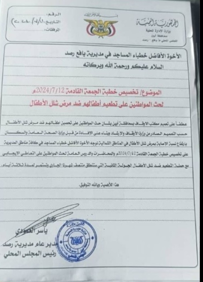 أصدرت السلطة المحلية في مديرية يافع رصد بمحافظة أبين يوم الخميس 2024/7/11م تعميماً لجميع خطباء المساجد في كافة مناطق وقرى المديرية تطلب منهم تخصيص خطبة يوم غداً الجمعة 2024/7/12م عن أهمية التطعيمات ضد مرض شلل الأطفال وأمراض الطفولة الأخرى القاتلة وجاء في التعميم مايلي: