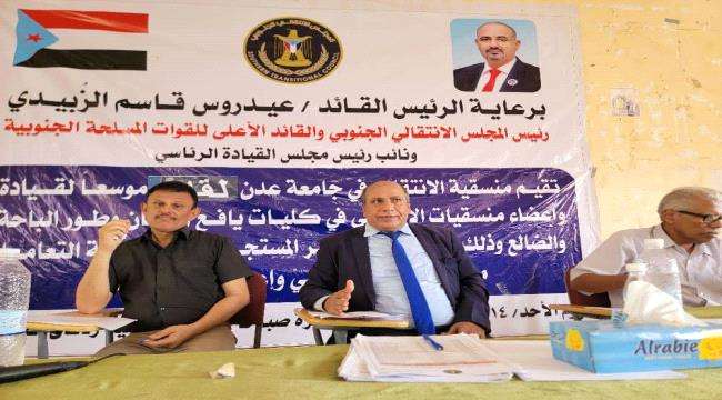 منسقية انتقالي جامعة عدن تعقد لقاءً موسعاً مع قيادة وأعضاء المنسقيات بكليات ردفان ويافع وطور الباحة والضالع