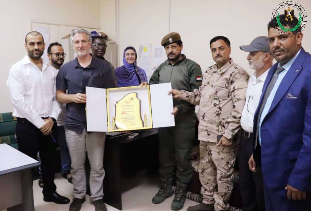وقدم أركان الحزام الأمني بعدن، العقيد عمار السرحي، درع الشكر والعرفان لكل من الدكتور العميد عارف الداعري، رئيس الهيئة الصحية العليا للقوات المسلحة الجنوبية، و منظمة أطباء بلا حدود ممثلة بالمدير الإقليمي للبعثة مارك شاكال، والمستشفى الألماني ممثلا بمديرها الدكتور محمد العياشي، على دورهم الهام في تقديم الخدمات الصحية لمنتسبي الحزام والقوات المسلحة الجنوبية وكذلك المواطن بشكل عام.