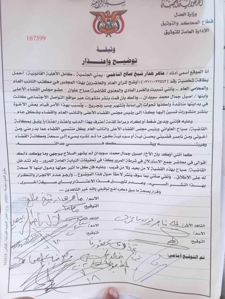 أنا الموقع أسمي أدناه / ماهر هدار شيخ صالح الناخبي ، يمني الجنسية ، كامل الأهلية القانونية، أحمل بطاقة شخصية رقم ( ٠٣١١٠٠٢٢٥٤٢ ) ، أوضح للرأي العام والحاضرين بهذا المجلس في مكتب النائب العام. والمحامي العام ... بأنني تسببت بالضرر المادي والمعنوى للقاضية / صباح علوان - عضو مجلس القضاء الأعلى. وأبنها / اصيل جمال محمد سويدان .. وذلك بأن قمت بنشر منشورات عبر مواقع التواصل الاجتماعي كانت في بدايتها مناشدة ولكنها تحولت إلى إساءة وتشهير وسب وتجريح .. وتسبب بهذا الأمر قيام بعض الأخوة بنشر منشورات تسيئ إليها وكذا إلى رئيس مجلس القضاء الأعلى والنائب العام والقضاء بشكل عام .. وعليه فإنني وبدون ضغط أو إكراه وبراءة للذمة أعترف بهذا الذنب واعتذر اعتذاراً يليق بمكانة القاضية صباح العلواني ورئيس مجلس القضاء الأعلى والنائب العام وكل منتسبي القضاء عما بدر مني ومن أخوتي ومن ناصر قضيتي بحسن نية أو سوء نية كون ما تم نشره يسيء إلى سمعة ومكانة القضاء