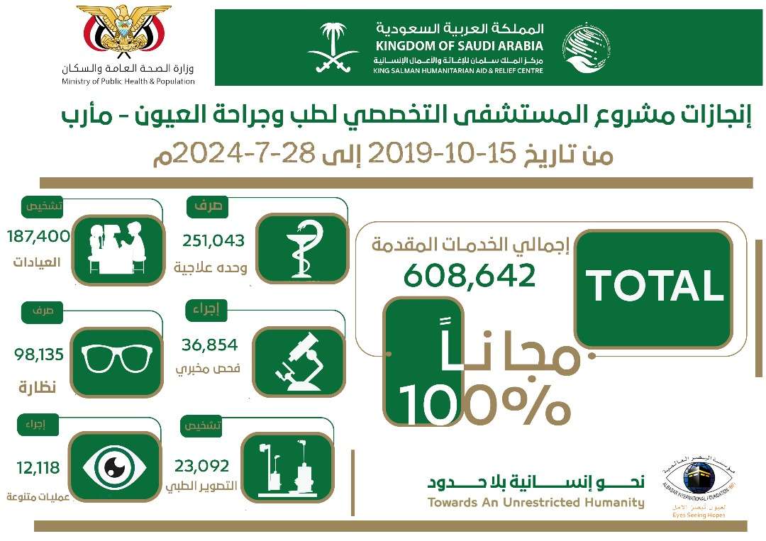 بتمويل من مركز الملك سلمان: مستشفى العيون التخصصي بمأرب يقدم أكثر من 600 ألف خدمة مجانية
