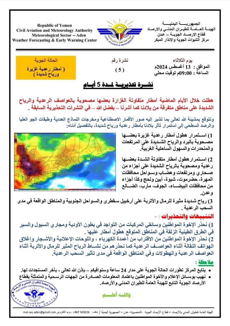 2) استمرار هطول أمطار متفاوتة الشدة، بعضها رعدية ومصحوبة بالرياح الشديدة، على أجزاء من صحاري ومرتفعات وهضاب وسواحل محافظات (المهرة، حضرموت، شبوة، أبين ولحج)، وكذا أجزاء من محافظات (البيضاء، الجوف، مأرب، الضالع وعدن).