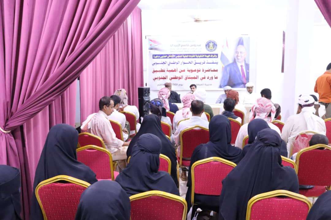 نظم فريق الحوار الوطني الجنوبي بالتعاون مع القيادة المحلية للمجلس الانتقالي الجنوبي في محافظة المهرة، يوم أمس الثلاثاء، ندوة توعوية بعنوان"أهمية تطبيق ما ورد في الميثاق الوطني الجنوبي في محافظة المهرة".