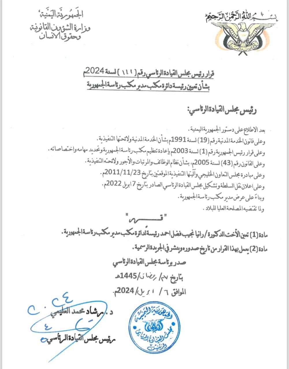 ومن بين القرارات تعيين رانيا نجيب رئيس دائرة مكتب مدير مكتب رئاسة الجمهورية، وسبق تعيين سكرتير صحفي كان يعمل في مناطق سيطرة الحوثي، إضافة إلى آخرين كانوا في تركيا من المنتيمين لحزب الإصلاح.