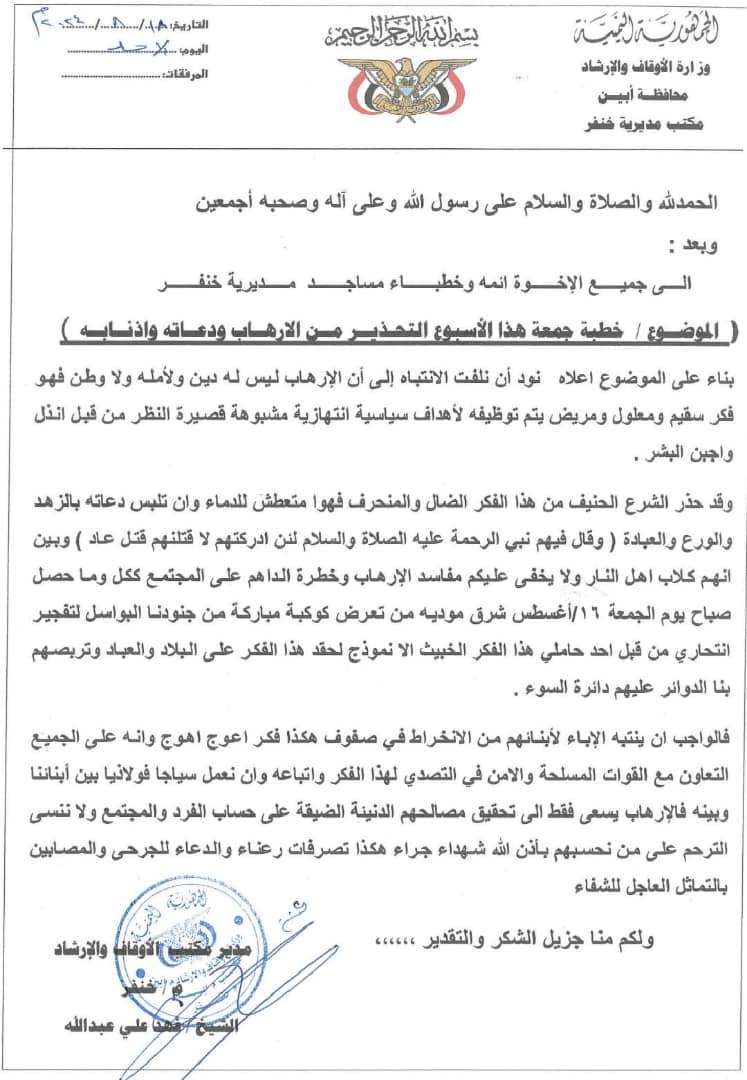 واشار مدير مكتب الأوقاف والإرشاد بمديرية خنفر في رسالة التعميم إن يقوم الخطيب بدوره في توعية الناس من خطر الإرهاب على المجتمع ككل وما حصل صباح يوم الجمعة 16 أغسطس 2024م شرق مديرية مودية بتعرض كوكبة من جنودنا الجنوبيين البواسل لتفجير انتحاري.