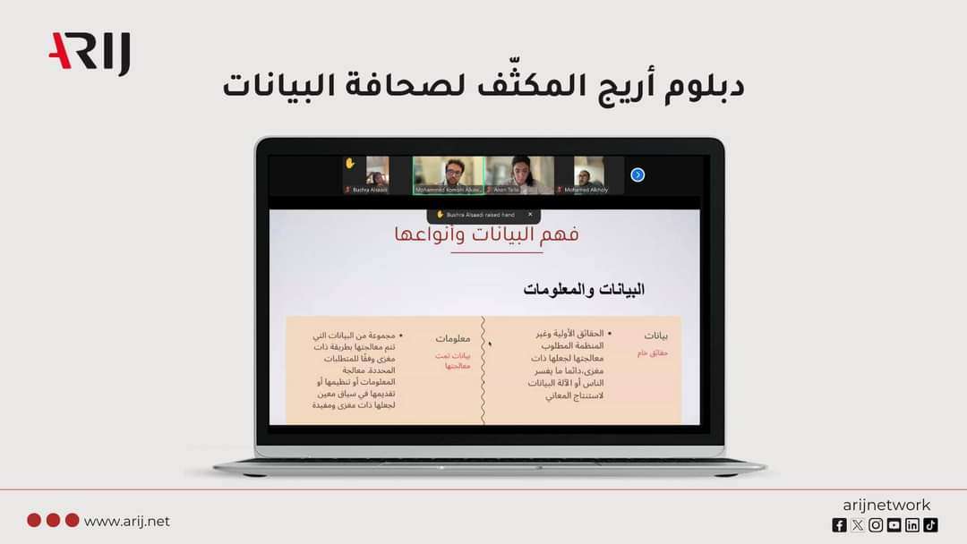تواصل شبكة "إعلاميون من أجل صحافة استقصائية" (أريج) تدريب الصحفيين المشاركين في دبلوم صحافة البيانات المكثّف، للأسبوع الثامن على التوالي، عبر تطبيق "Zoom".