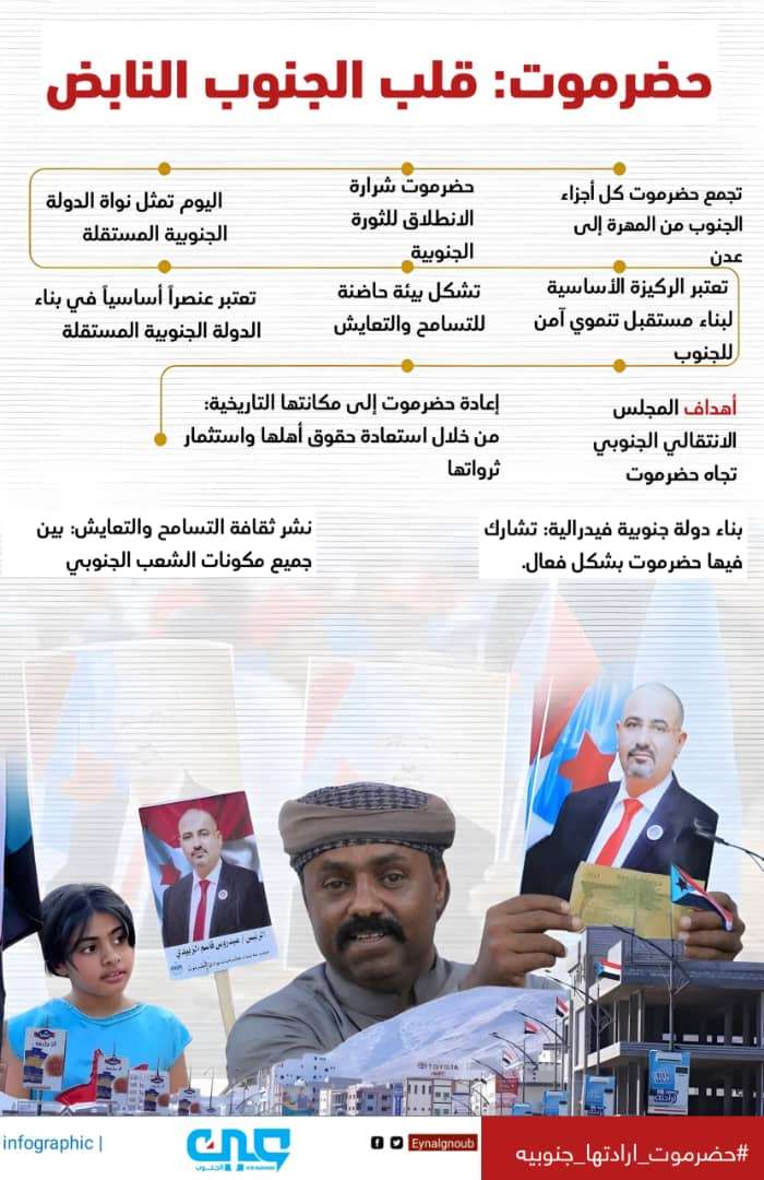 وأوضحوا بأن: "المجلس الانتقالي الجنوبي بقيادة الرئيس القائد عيدروس بن قاسم الزُبيدي، هو نتاج لتراكم نضالي تواصل على مدار ثلاثة عقود، كانت محافظة حضرموت هي منطلقه الأول بعد حرب صيف 1994م، الظالمة"، مشيرين إلى أن: "حضرموت قدمت، وما زالت، قوافل من الشهداء الميامين بهدف استقلال الجنوب، واستعادة دولته وهويته".