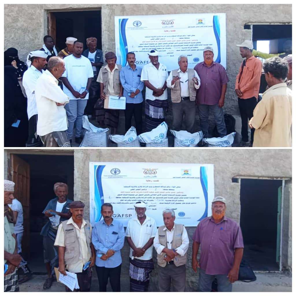برعاية معالي وزير الزراعة الري والثروة السمكية اللواء/سالم عبدالله السقطري ومحافظ محافظة لحج اللواء ركن أحمد عبدالله التركي والدكتور حسين جادين ممثل منظمة الأغذية والزراعة التابعة للأمم المتحدة الفاو اختتمت المؤسسة العامة لإكثار البذور المحسنة-لحج صباح اليوم الإثنين توزيع الغربة لعدد 100مزارع في مديرية المضاربة ورأس العارة بمحافظة لحج ويأتي ذلك ضمن أنشطة مشروع الإستجابة لتعزيز الأمن الغذائي في اليمن الممول من مجموعة البنك الدولي.