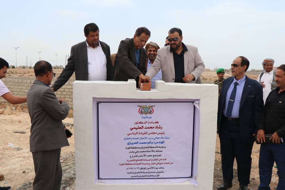 وضع وزير الأشغال العامة والطرق المهندس سالم الحريزي، ومحافظ محافظة المهرة امحمد علي ياسر، اليوم، حجر الأساس لمشروع التدخل الطارئ لصيانة المقاطع المتضررة من إعصار تيج في شوارع مدينة الغيضة.