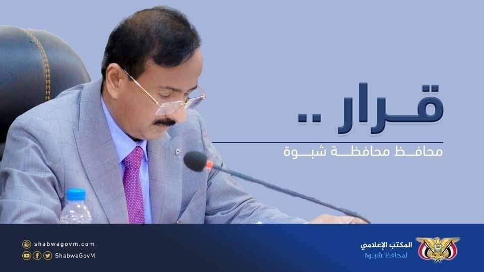 أصدر محافظ محافظة شبوة عوض محمد بن الوزير القرار رقم (11) لسنة 2024م بشأن تكليف قائم بأعمال مدير عام فرع الهيئة العامة للتأمينات والمعاشات م/ شبوة