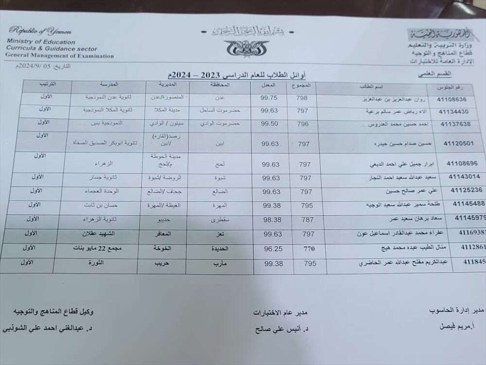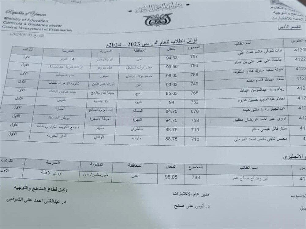 وتم الإعلان خلال حفل إقامته الوزارة في مقرها بالعاصمة عدن وخلال الحفل إعلنت الوزارة نتائج الثانوية العامة بشقيقها العلمي والأدبي.