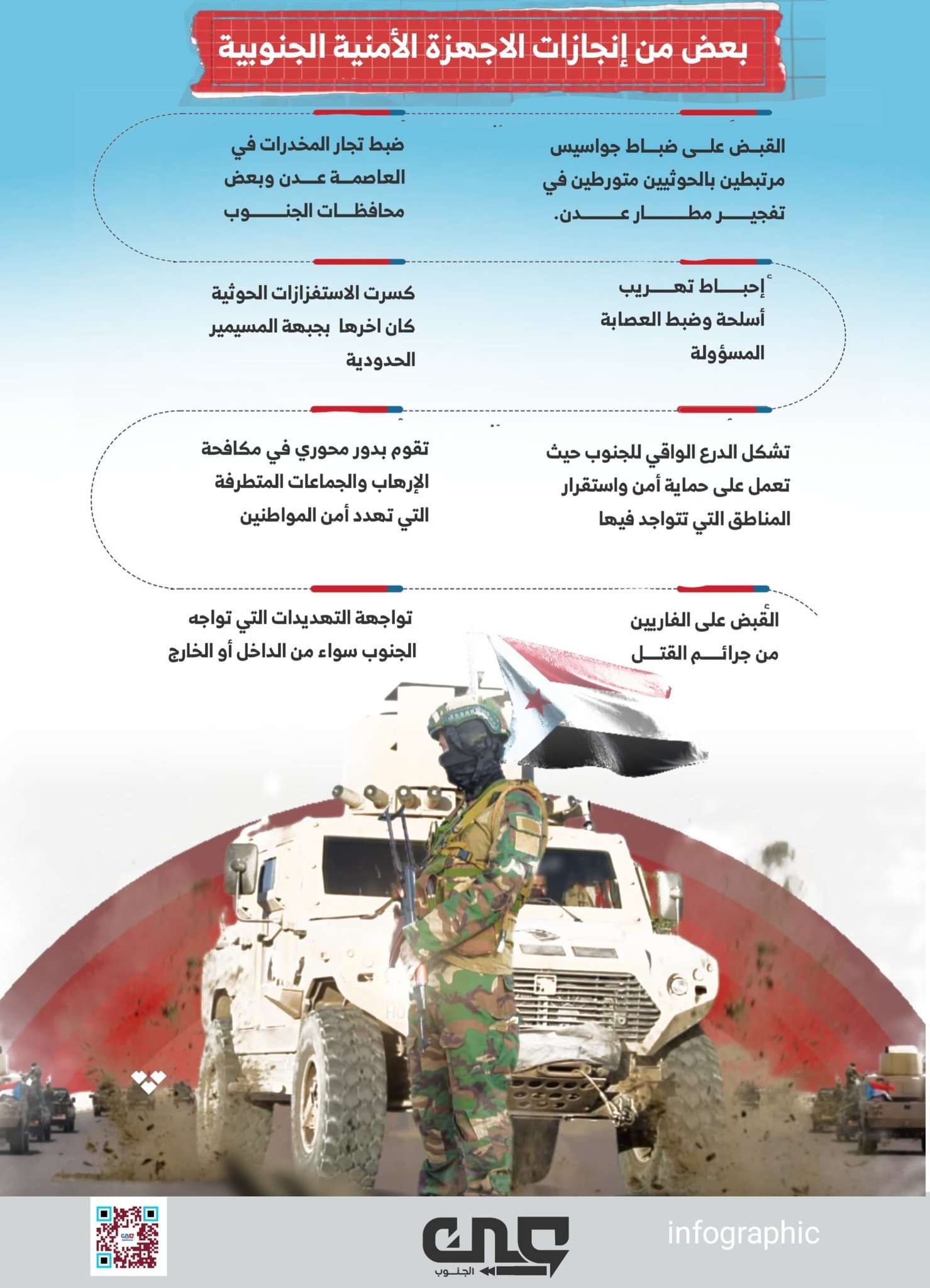 ودعوا أبناء الجنوب إلى التعاون مع الأجهزة الأمنية الجنوبية، والإبلاغ عن أي تحركات مشبوهة تضر أمن واستقرار العاصمة الجنوبية عدن خاصة، والجنوب عامة.