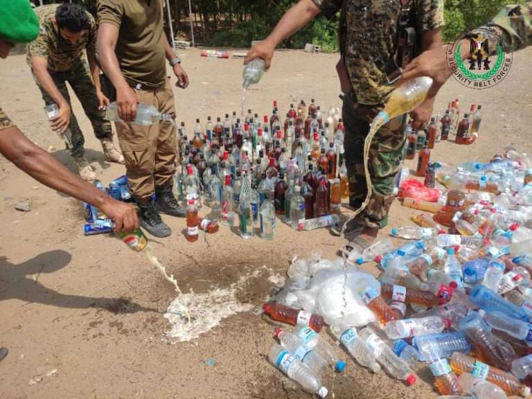قوات الحزام الأمني بلحج تتلف كمية كبيرة من الخمور