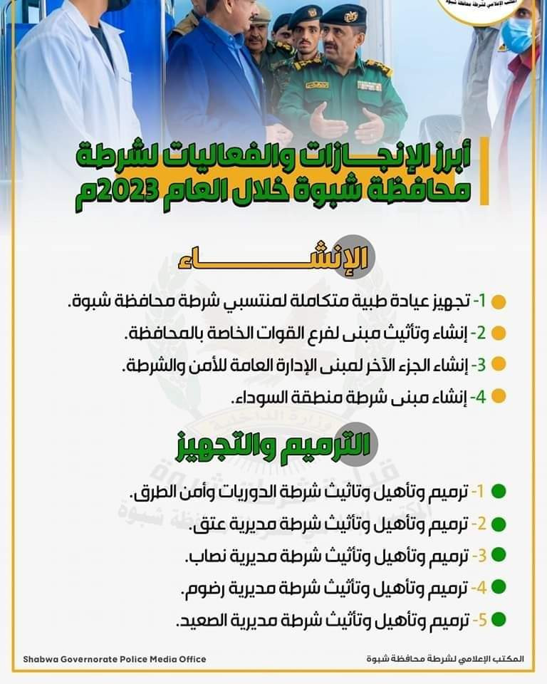 ويتم العمل على استكمال هذه المشاريع جميعا لتحسين مستوى الخدمات الأمنية وتوفير بيئة آمنة للمواطنين في محافظة شبوة.
