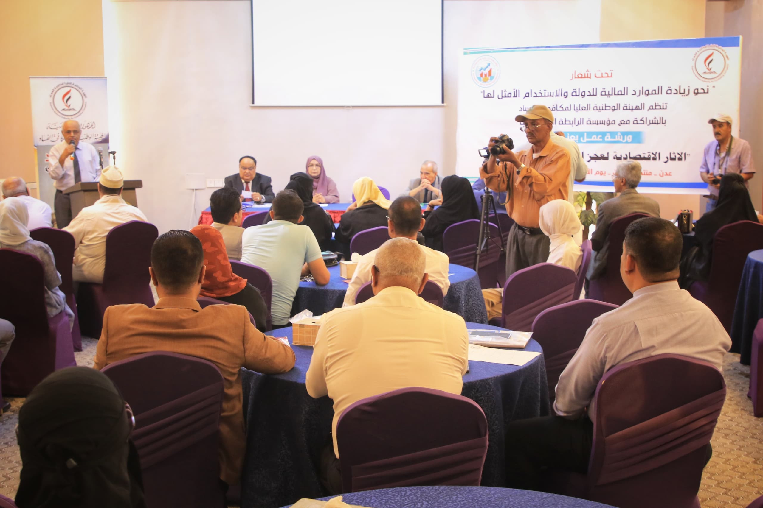 الهيئة العليا لمكافحة الفساد ومؤسسة الرابطة الاقتصادية تنظمان ورشة حول الأثار الاقتصادية لعجز الموارد المالية للدولة