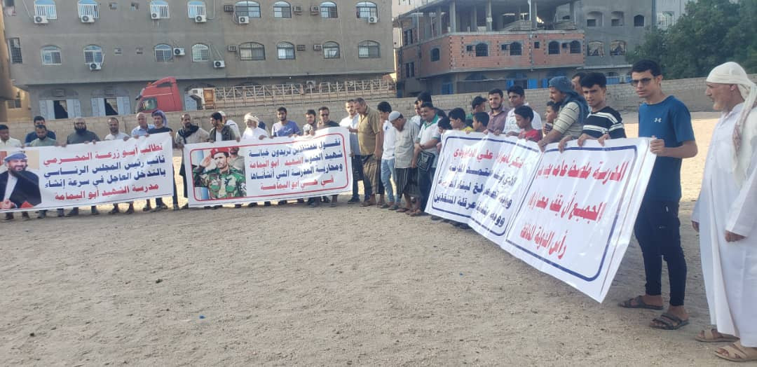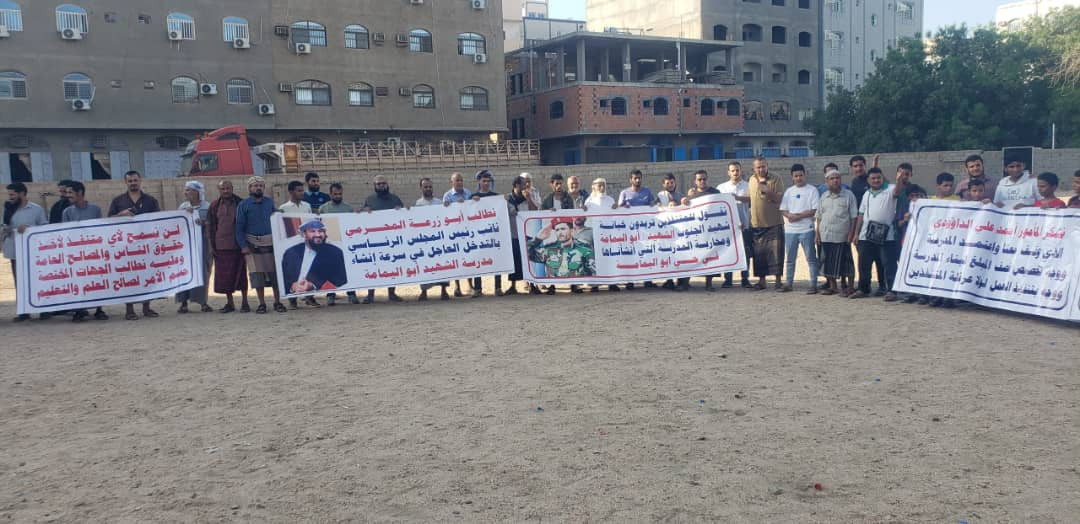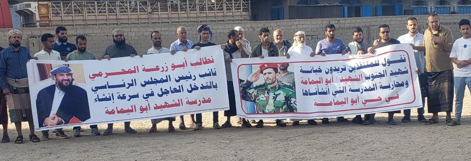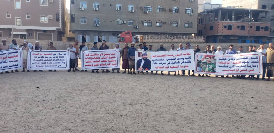 طالب أهالي حي الشهيد أبو اليمامة بمديرية المنصورة في العاصمة عدن اليوم خلال وقفة احتجاجية نائب رئيس مجلس القيادة القائد أبو زرعة المحرمي سرعة التدخل لبناء مدرسة الحي التي تعرضت للايقاف بسبب نافذين.