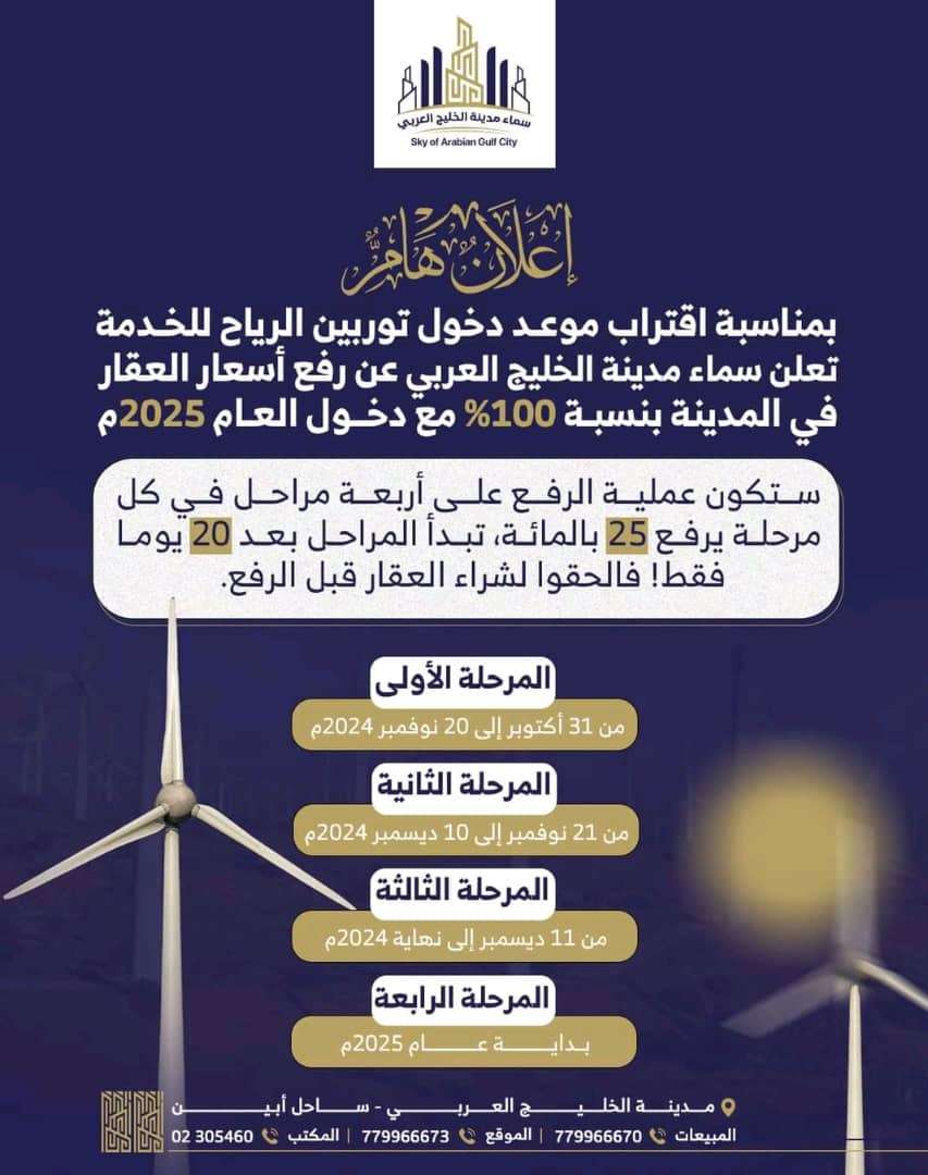 أعلنت سماء مدينة الخليج العربي عن رفع أسعار العقارات في المدينة بنسبة 100% تزامناً مع اقتراب موعد دخول توربين الرياح الجديد للخدمة. يبدأ تطبيق هذا القرار على أربع مراحل، بزيادة قدرها 25% في كل مرحلة، على أن تبدأ أولى المراحل بعد 20 يوماً.