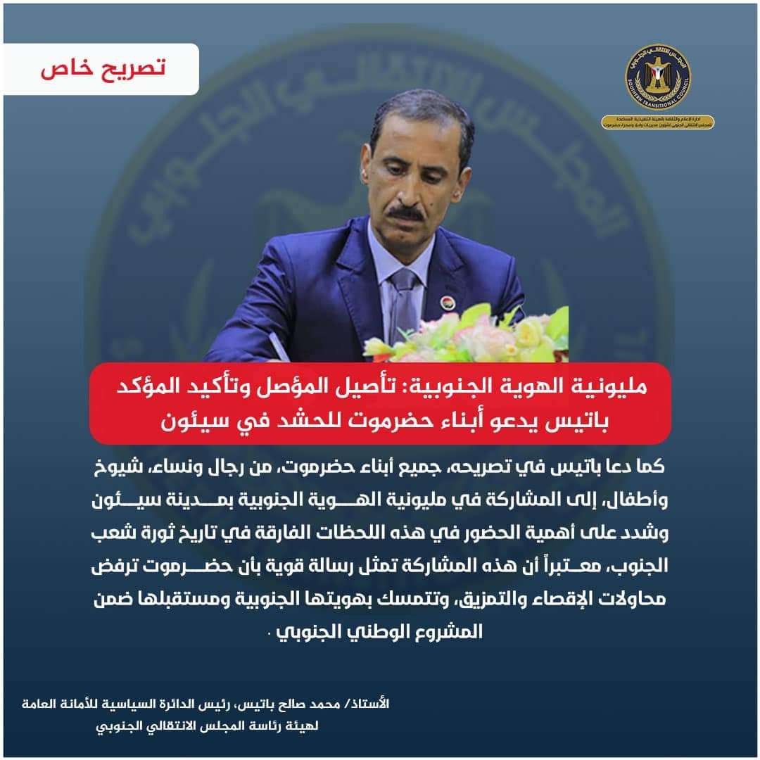 باتيس يدعو أبناء حضرموت للحشد والمشاركة في مليونية الهوية الجنوبية بمدينة سيئون