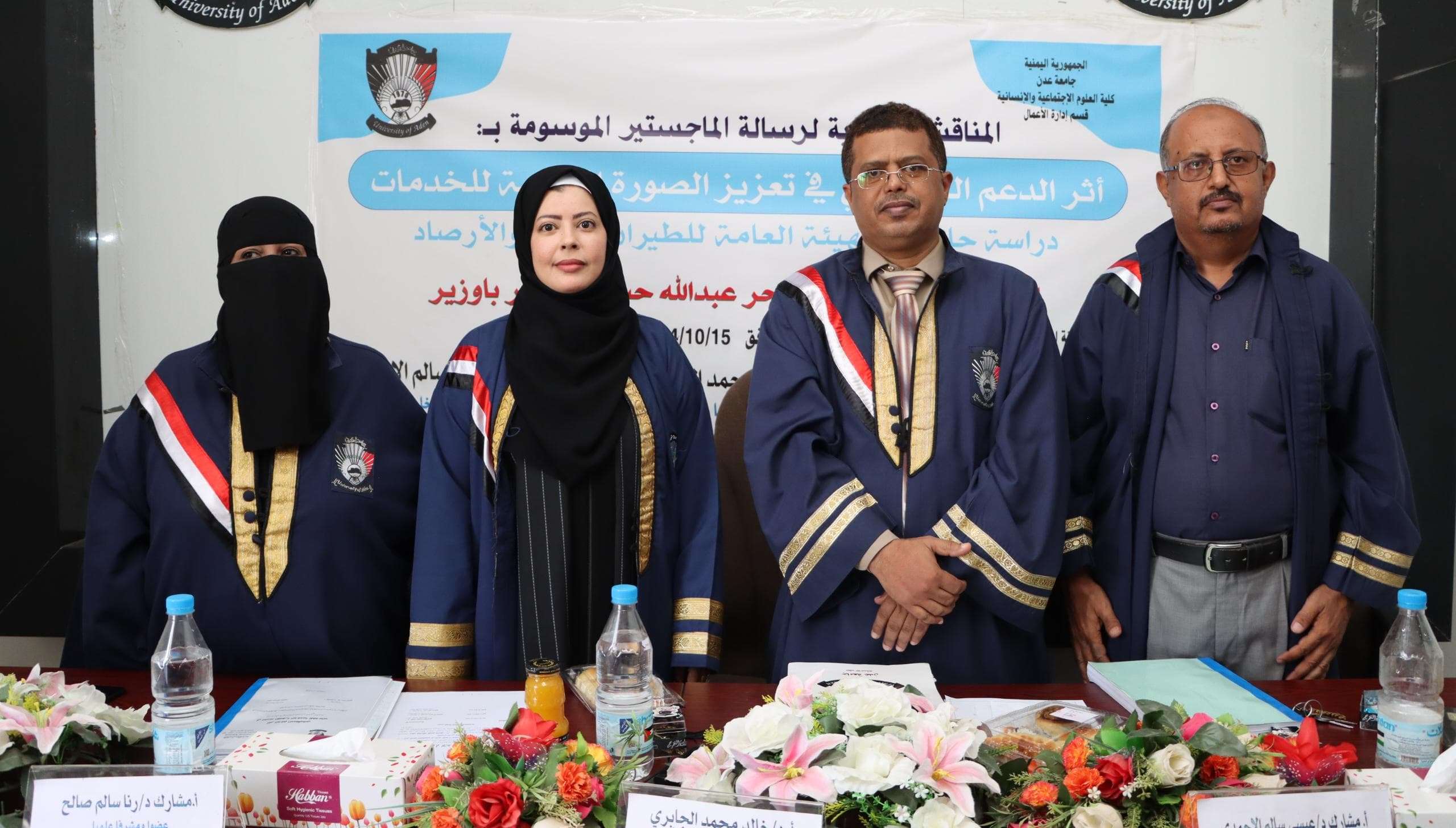 نالت الباحثة سحر عبدالله باوزير، درجة الماجستير بامتياز من جامعة عدن، في تخصص "إدارة الأعمال"، عقب المناقشة العلنية لرسالتها العلمية الموسومة بـ (أثر الدعم التنظيمي في تعزيز الصورة الذهنية للخدمات) دراسة حالة في الهيئة العامة للطيران المدني والأرصاد.