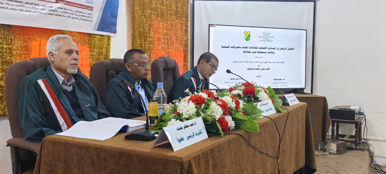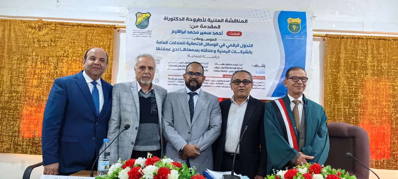 نال الباحث أحمد سمير محمد إبراهيم، درجة الدكتوراه في العلاقات العامة، من كلية الإعلام، جامعة صنعاء، بمرتبة الشرف مع التوصية بطباعة وتداول الرسالة بين الجامعات والشركات، عن أطروحته الموسومة بـ" التحول الرقمي في الوسائل الاتصالية للعلاقات العامة بالشركات اليمنية وعلاقته بسمعتها لدى عملائها".
