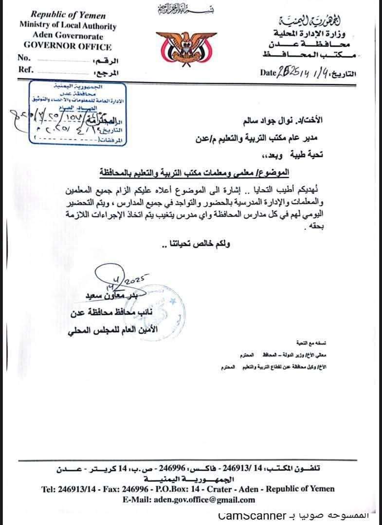 وصدر التوجيه من نائب محافظ عدن، الأمين للعام للمجلس المحلي، بدر معاون سعيد، إلى مديرة مكتب التربية والتعليم بعدن، الدكتورة نوال جواد، باتخاذ كافة الإجراءات اللازمة بحق أي مدرس أو إداري يتغيّب عن مدرسته.