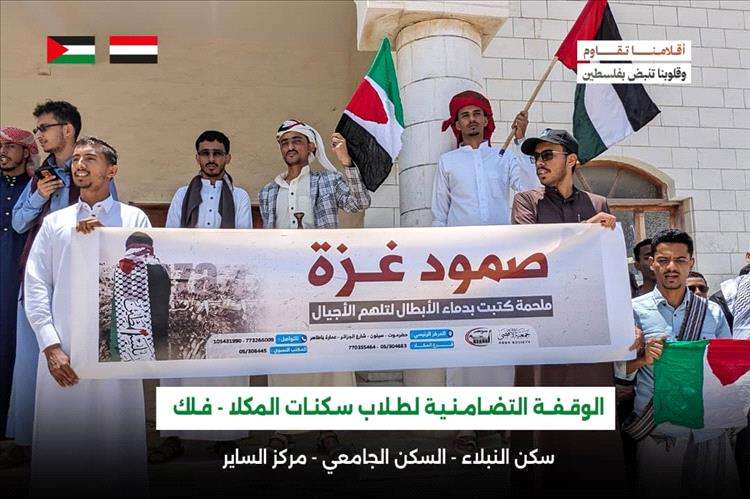 نظّم طلابُ سكنات (النبلاء والسكن الجامعي ومركز الساير) في منطقة فلك بمدينة المكلا وقفةً تضامنيةً مع أبناء الشعب الفلسطيني، وذلك في ساحة جامع جامعة حضرموت بفلك، تحت شعار:
