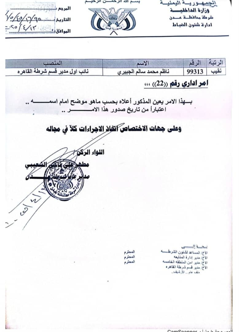 أصدر مدير عام شرطة العاصمة عدن، اللواء الركن مطهر علي ناجي الشعيبي، قراراً إدارياً قضى بتعيين النقيب ناظم محمد سالم الجبيري نائباً أول لمدير شرطة القاهرة بمديرية المنصورة.