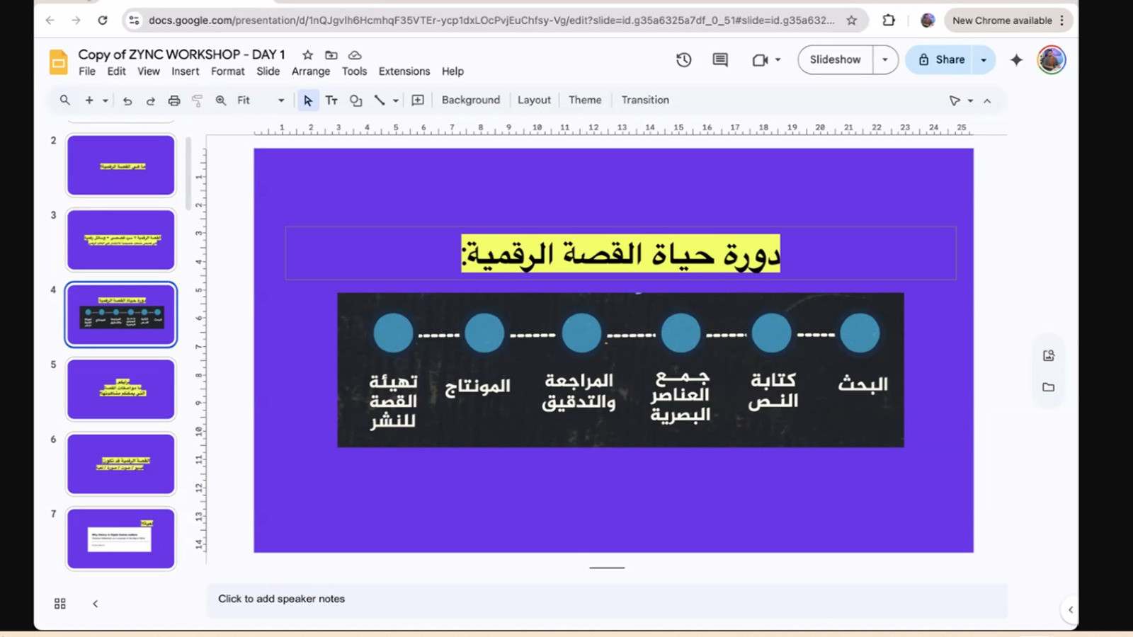 تناولت الجلسة مفهوم المنصات الرقمية ومعايير اختيار المنصة المناسبة للقصة إلى جانب فهم الغرض الشخصي في بناء السرد القصصي، واستعراض أنواع القصص الرقمية وتطرقت إلى كيفية إضافة المفاتيح الذهبية لصناعة الإيقاع البصري المؤثر.