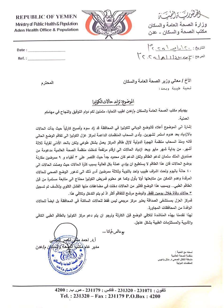وأشار الخطاب الرسمي الصادر عن مدير عام مكتب الصحة بعدن، إلى أن عدد الحالات المصابة بالكوليرا يشهد ارتفاعًا حادًا، حيث يستقبل مركز الكوليرا الرئيسي بمستشفى الصداقة التعليمي أكثر من 40 حالة يوميًا، بينها حالات حرجة، وُثِقَت منها أربع حالات وفاة خلال الأيام القليلة الماضية.