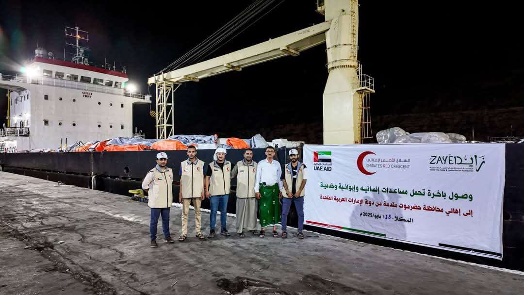 رست يوم أمس في ميناء المكلا باخرة إماراتية تحمل على متنها أطنانًا من المساعدات الغذائية والإنسانية والإيوائية والخدمية، مقدمة من دولة الامارات العربية المتحدة سيرتها هيئة الهلال الأحمر الإماراتي إلى أهالي محافظة حضرموت.