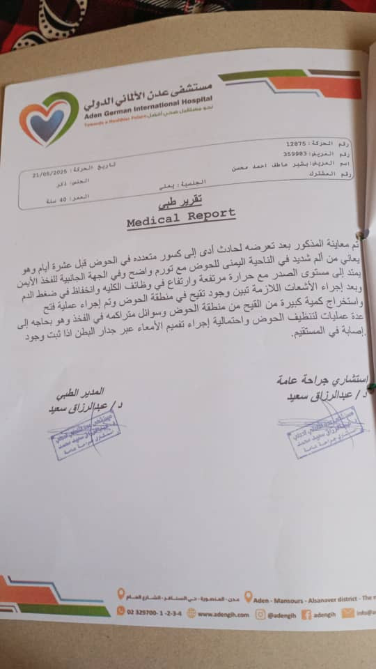 وأفاد الأطباء بأن حالته استدعت تدخلاً جراحياً طارئاً لإزالة الأنسجة المتضررة، وقد تم نقله إلى قسم العناية المركزة لمراقبة وضعه الصحي بشكل دقيق. وتحت إشراف أخصائيين في العظام والجراحة والباطنية والمسالك البولية، خضع الشنبكي لفحوصات مكثفة تضمنت الأشعة المقطعية والعلاجات الأولية.