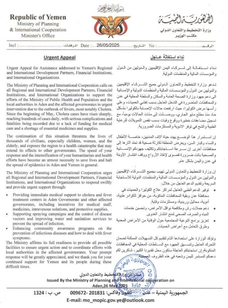 تدعو وزارة التخطيط والتعاون الدولي في الجمهورية اليمنية، كافة الشركاء الإقليميين والدوليين من الدول الصديقة، والمؤسسات المالية، والمنظمات الدولية والإنسانية، إلى التحرك العاجل لدعم جهود وزارة الصحة العامة والسكان والسلطات المحلية في العاصمة المؤقتة عدن والمحافظات المتضررة، لمواجهة الانتشار الواسع لتفشي الحميات وعلى رأسها وباء الكوليرا، الذي يشهد تصاعداً مقلقاً منذ مطلع مايو الجاري، مع تسجيل مئات الإصابات يوميًا، وظهور مضاعفات خطيرة ووفيات متزايدة نتيجة نقص التمويل وضعف الإمكانات الطبية وشح الأدوية والمستلزمات الضرورية.