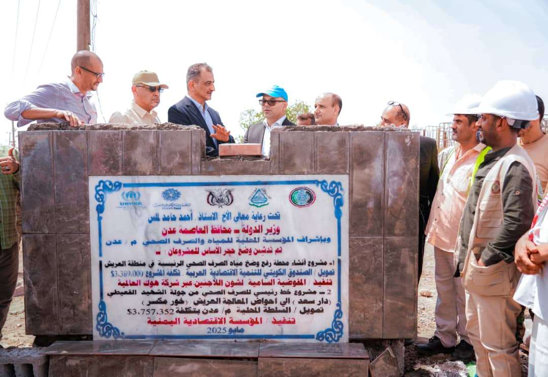 محافظ العاصمة عدن ورئيس مكتب مفوضية اللاجئين يضعان حجر الأساس لمشروع محطة ضخ الصرف الصحي بالعريش