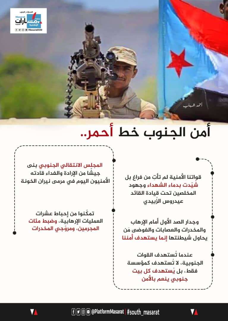 وختم مقاله بالقول: "إن أمن الجنوب خط أحمر. قواتنا المسلحة والأمنية هي درع الوطن، وأي محاولة لتشويهها خيانة عظمى. النقد البنّاء مرحب به، أما التشويه الممنهج فمرفوض رفضًا قاطعًا".