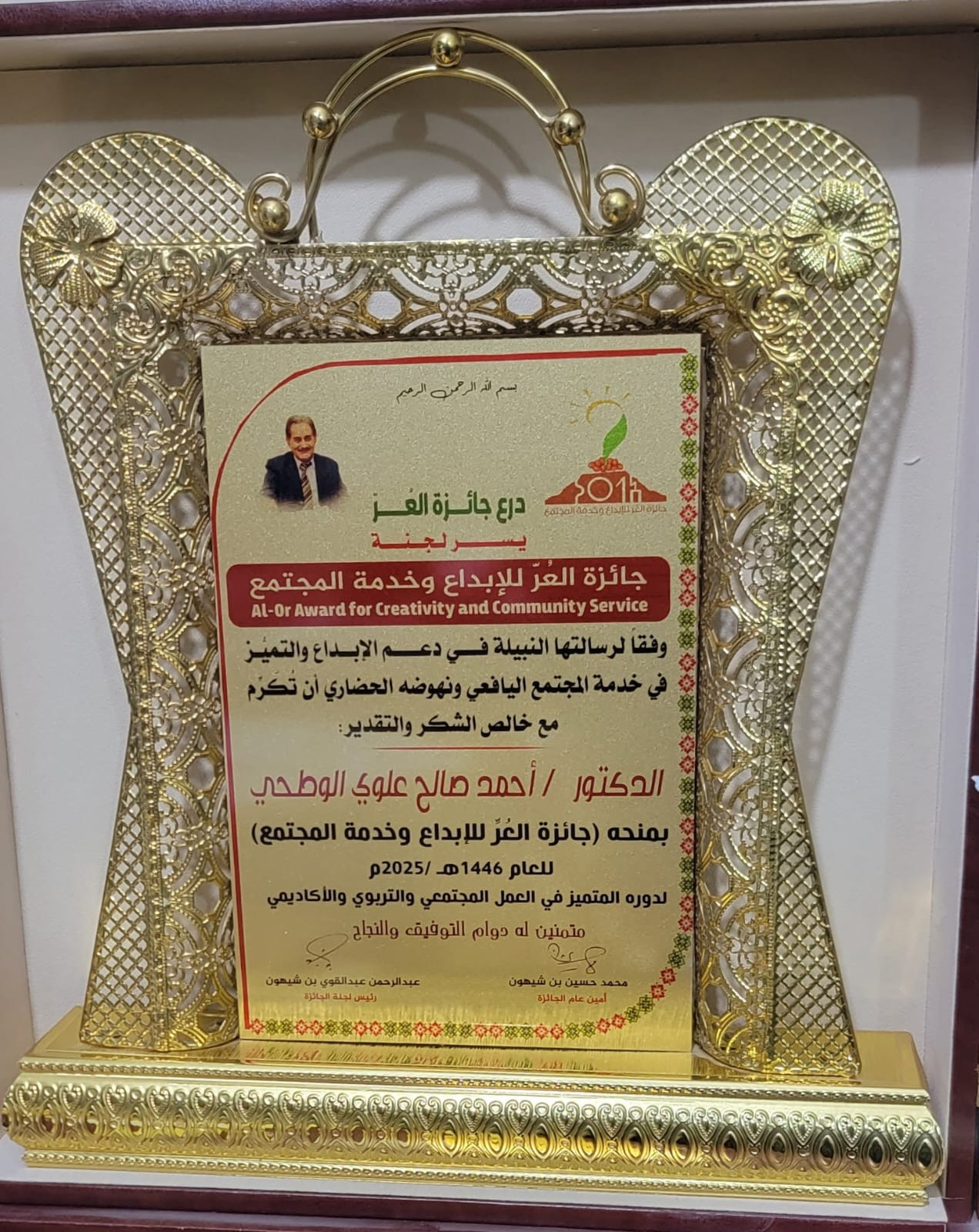 الدكتور أحمد صالح علوي الوطحي الفائز بجائزة العر للإبداع وخدمة المجتمع لهذا العام ٢٠٢٥م