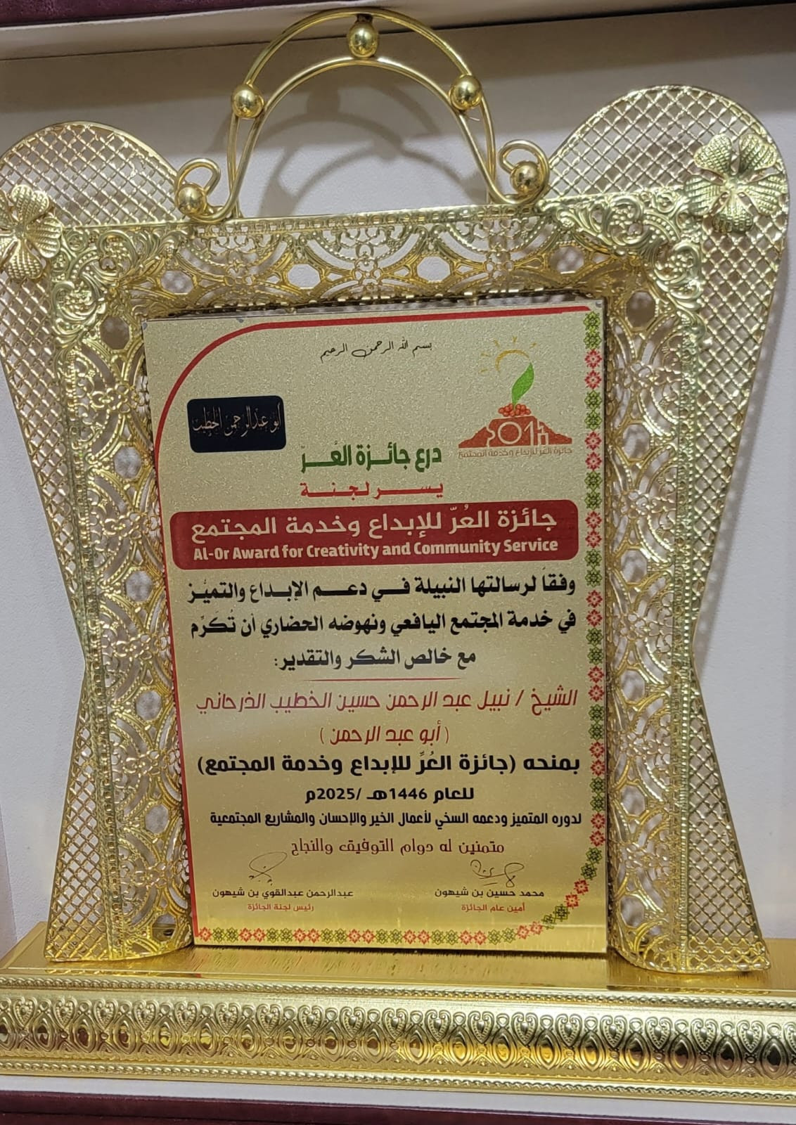 الشيخ أبو عبد الرحمن نبيل الخطيب الذرحاني الحائز على جائزة العر للإبداع وخدمة المجتمع لعام 2025م