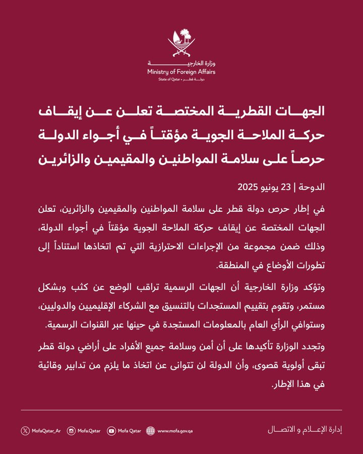 أعلنت دولة قطر إيقاف حركة الملاحة الجوية مؤقتا في أجوائها ضمن مجموعة من الإجراءات الاحترازية التي تم اتخاذها استنادا إلى تطورات الأوضاع في المنطقة.